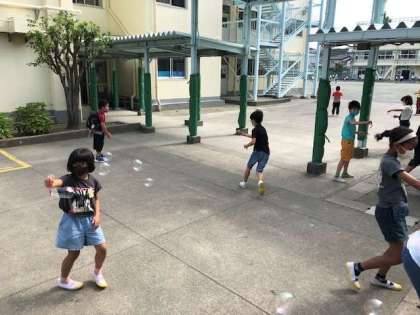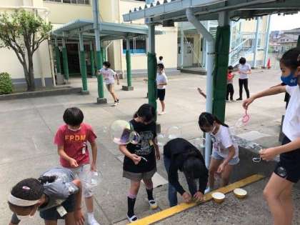 風の力を利用したり、体を動かしたりすることで、たくさんのシャボン玉を作ることができました☆