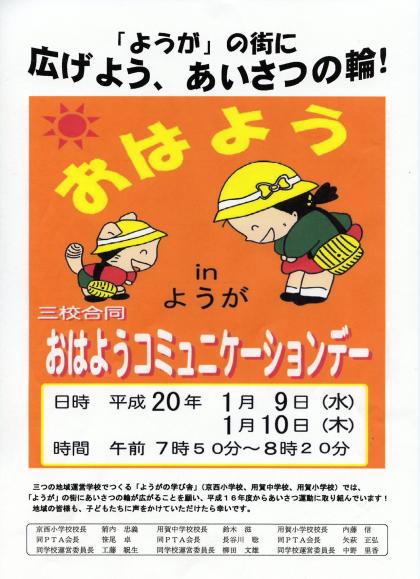 1/9おはようコミュニケーションのパンフレットです。 公開日 2008/01/09 更新日 2008/01/09 世田谷9年教育・ようがの学び舎 おはようコミュニケーションのパンフレットです。 新聞の折り込みで地域の皆様に配布されました。 これを機に、おはようコミュニケーションが地域に認められ、輪が広がっていくことを願っています。