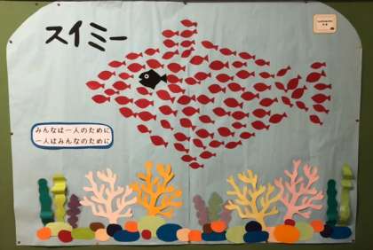 主事室前には「スイミー」。アメリカの絵本作家レオ・レオニ作の絵本で、日本では、谷川俊太郎の翻訳により1969年に出版されました。2年生の国語の教科書にも1977年から掲載されているなど、ずっとみんなに愛され続けている作品です。2年生は、ちょうど先日まで学習していましたね。