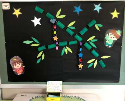 図書室前には、七夕の作品が展示されています。学校便りでもお伝えしたように、現在は、ここに子どもたちの書いたたくさんの短冊が貼られています。今のところ、7日は雨マークが付いていますが、願いが叶うと良いですね!
