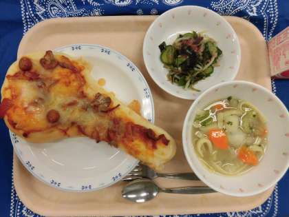 7/8 本日の給食 公開日 2021/07/08 更新日 2021/07/08 給食 〜今日の献立〜 ナンピザ 牛乳 海そうサラダ ヌードルスープ 〜給食メモ〜 今日は、サラダに使った「海そう」のクイズを出したいと思います。海そうにたくさん入っている、おなかの中をきれいにそうじしてくれる栄養素は、次のうちのどれでしょうか? 1. たんぱく質 2. 脂質 3. 食物繊維 ※クイズのこたえは、「食材がとれたところ…」の最後にのせています。 食材がとれたところ・・・ 閉じる 食材がとれたところ… 豚肉…神奈川県 じゃがいも…長崎県 にんにく…青森県 たまねぎ…愛知県 ピーマン…茨城県 もやし…栃木県 きゅうり…秋田県 にんじん…千葉県 キャベツ…群馬県 パセリ…長野県 クイズのこたえは、3の「食物繊維」です。海そうには、食物繊維だけでなく、骨や歯を丈夫にしてくれる「カルシウム」など、たくさんの栄養素が入っています。残さず食べましょう。