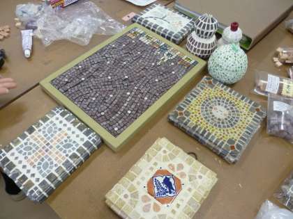 今日は用賀小学校を会場として、世小研図工部の実技研修会が行われました。天然石のタイルを、ニッパで小さく形成して貼り付けていきます。