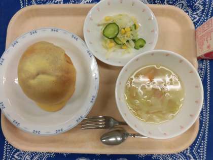 7/15 本日の給食 公開日 2021/07/15 更新日 2021/07/15 給食 〜今日の献立〜 ビスキュイパン 牛乳 コーンサラダ ベーコンと野菜のスープ 〜給食メモ〜 今日は、「ビスキュイパン」のクイズを出したいと思います。「ビスキュイパン」の「ビスキュイ」は、次のうちのどの国の言葉でしょうか? 1. イタリア 2. フランス 3. ドイツ ※クイズのこたえは、「食材がとれたところ…」の最後にのせています。 食材がとれたところ・・・ 閉じる 食材がとれたところ… 鶏卵…青森県 キャベツ…長野県 きゅうり…秋田県 にんじん…青森県 たまねぎ…愛知県 セロリー…長野県 クイズのこたえは、2の「フランス」です。ビスキュイとは、小麦粉に卵やバター、牛乳などを加えて焼いたフランスのお菓子のことを言うそうで、給食ではパンの上に手作りのビスキュイ生地を塗って焼いて作りました。調理員さんがパンのひとつひとつにジャムを挟んで、生地を塗って焼いてくれました。残さず食べましょう。