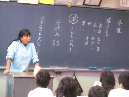 5年生では日本の伝統文化を学ぶ(日本語)ためにお茶をたてました。今日は5年2組での授業でしたが、茶道の心について学びながらお薄をいただきました。