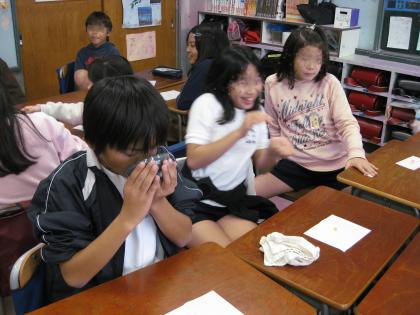 残念ながら用賀小学校には、和室がありませんから、教室の机の上で立てました。思ったよりおいしいとの感想ですが、心静かにお茶をたてる経験で、茶道の心に少しだけ触れたようです。