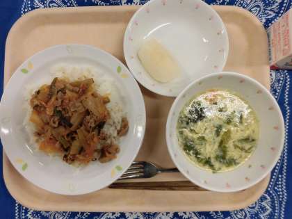 9/6 本日の給食 公開日 2021/09/06 更新日 2021/09/06 給食 〜今日の献立〜 豚キムチ丼 牛乳 トックスープ くだもの(梨) 〜給食メモ〜 今日のくだものは、今が旬の「梨」です。そこで、今日は「梨」のクイズを出したいと思います。梨のシャリシャリした食感は、○○細胞と呼ばれるものです。さて、○○に入る言葉は何でしょうか? 1. 氷 2. 砂 3. 石 ※クイズのこたえは、「食材がとれたところ…」の最後にのせています。 食材がとれたところ・・・ 閉じる 食材がとれたところ… 米…埼玉県 豚肉…神奈川県 鶏肉…岩手県 鶏卵…青森県 わかめ…熊本県 にんにく…青森県 たまねぎ…北海道 ねぎ…青森県 にら…栃木県 白菜…長野県 万能ねぎ…福岡県 しょうが…高知県 にんじん…北海道 だいこん…北海道 えのき…新潟県 梨…長野県 クイズのこたえは、3の「石」です。梨のシャリシャリした食感は「石」に「細胞」と書いて「石細胞」と呼ばれるものです。石細胞には、おなかの中をきれいにしてくれるはたらきがあります。Bグループの人は、今日から2学期の給食が始まります。2学期も、残さず食べましょう。