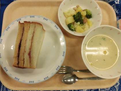 9/14 本日の給食 公開日 2021/09/14 更新日 2021/09/14 給食 〜今日の献立〜 ベリーベリーサンド 牛乳 ウインナーと 野菜のソテー コーンポタージュ 〜給食メモ〜 今日は、ベリーベリーサンドのクイズを出したいと思います。今日のベリーベリーサンドには、次のどのジャムを使って作ったでしょうか? 1. ブルーベリー 2. ラズベリー 3. ストロベリー ※クイズのこたえは、「食材がとれたところ…」の最後にのせています。 食材がとれたところ・・・ 閉じる 食材がとれたところ… じゃがいも…北海道 ブロッコリー…北海道 カリフラワー…新潟県 にんにく…青森県 たまねぎ…北海道 パセリ…長野県 クイズのこたえは、1の「ブルーベリー」と3の「ストロベリー」の2つのジャムです。黒糖パンにはブルーベリージャムが、食パンにはストロベリージャムが挟んであります。