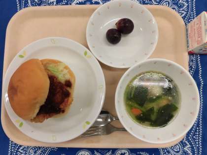 今日の給食は、運動会応援メニューで、「勝つ!!バーガー」と「紅白白玉スープ」を作りました。そこで今日は、「カツ」のクイズを出したいと思います。今日のカツバーガーのソースには、ある果物が入っています。さて、その果物とは次のうちのどれでしょうか?