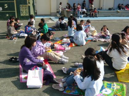 みたらし、あんこ、きなこ餅をお弁当箱に入れていただき、さっそく校庭などで食べました。つきたてのおもちは、やわらかくてとってもおいしかったです。