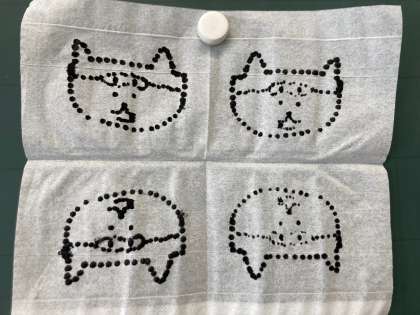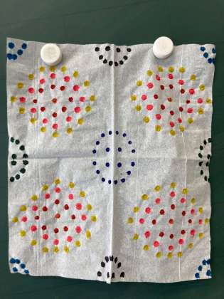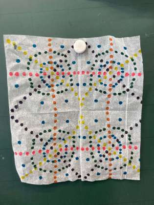 ティッシュペーパーを丁寧にたたんで、 色ペンでトントントン。 綺麗なもようができました。