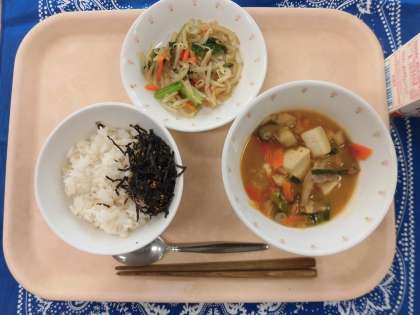 11/4 本日の給食 公開日 2021/11/04 更新日 2021/11/04 給食 〜今日の献立〜 麦入りごはん 韓国風ふりかけ 牛乳 チゲ豆腐 ナムル 〜給食メモ〜 今日は、韓国料理の「チゲ豆腐」のクイズを出したいと思います。チゲ豆腐の「チゲ」とは、韓国語で何という意味でしょうか? 1. キムチ 2. 辛い 3. 鍋 ※クイズのこたえは、「食材がとれたところ…」の最後にのせています。 食材がとれたところ・・・ 閉じる 食材がとれたところ… 米…埼玉県 豚肉…青森県 たら…北海道 こまつな…東京都 にんにく…青森県 にんじん…北海道 しいたけ…秋田県 しめじ…福岡県 白菜…長野県 ねぎ…新潟県 にら…栃木県 もやし…栃木県 クイズのこたえは、3の「鍋」です。給食のチゲ豆腐には、魚や豆腐、きのこや野菜などたくさんの食材を使っているので、栄養満点です。残さず食べましょう。