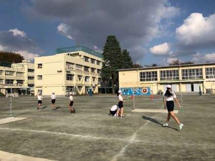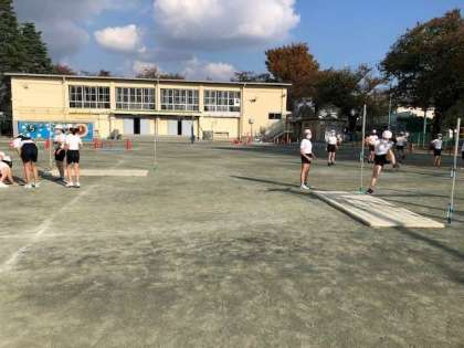 6年の校庭体育では、現在走り高跳びと投げる運動に分かれて活動しています。