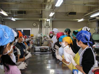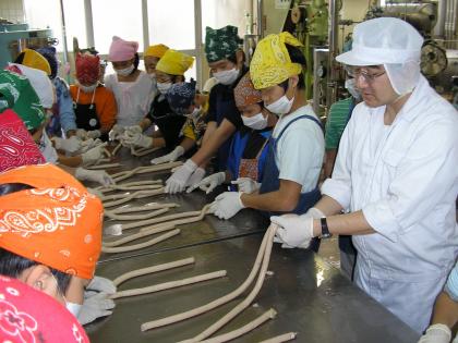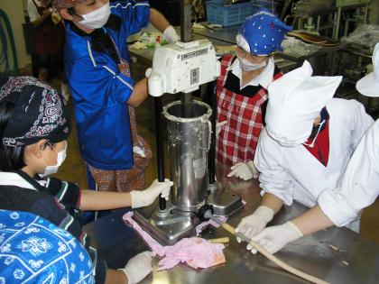 今日は、6年生の食育学習の第2回目でした。東京農業大学の調理室で、前回塩漬けにした肉をミンチにしてソーセージにします。