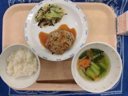 11/15 本日の給食 公開日 2021/11/15 更新日 2021/11/15 給食 〜今日の献立〜 ごはん 牛乳 豆腐とひじきのハンバーグ 野菜の塩昆布あえ こまつなのすまし汁 〜給食メモ〜 今日は、「豆腐とひじきのハンバーグ」に使った「ひじき」のクイズを出したいと思います。ひじきは海にはえていますが、海の中では何色をしているでしょうか? 1. 黒色 2. おうど色 3. 白色 ※クイズのこたえは、「食材がとれたところ…」の最後にのせています。 食材がとれたところ・・・ 閉じる 食材がとれたところ… 米…埼玉県 じゃがいも…北海道 豚肉…青森県 こまつな…東京都 たまねぎ…北海道 キャベツ…愛知県 きゅうり…埼玉県 にんじん…千葉県 えのき…新潟県 ねぎ…青森県 クイズのこたえは、2の「おうど色」です。ひじきは、海の中ではおうど色ですが、乾燥させると黒色になるそうです。ひじきには、骨や歯を丈夫にしてくれる「カルシウム」がたくさん入っています。残さず食べましょう。