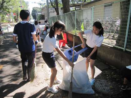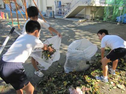 次は、6年生が担任の先生や主事さんと一緒になって手伝いをしてくれました。6年生のパワーは大きく、学校の敷地内外が、みるみるうちにきれいになりました。