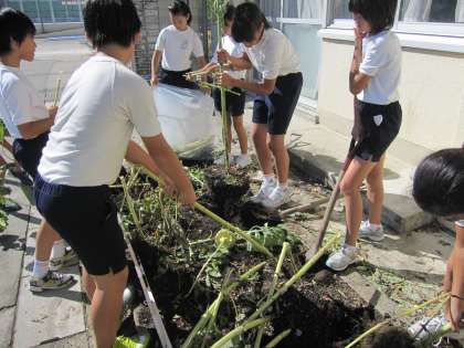 台風が過ぎ去った校庭には、ミニサッカーゴールやベンチが倒れていたり、たくさんの木の枝や葉っぱが散乱していました。1年生が育てているアサガオや花壇のひまわりもなぎ倒されていました。