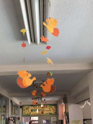 11/18ブックアシストクラブ作品展示 公開日 2021/11/18 更新日 2021/11/18 副校長より 主事室前と図書室廊下の天井に、新しい作品を展示してくださっています。柿やいちょう、どんぐりなどなど、秋がたくさん散りばめられています。そういえば、先日、用賀小の近くで目撃されたサルも、他の学校の近くで目撃されたときには柿を食べていたそうですよ。 個人面談や学校公開等でご来校いただいたときに、ご覧いただければと思います。