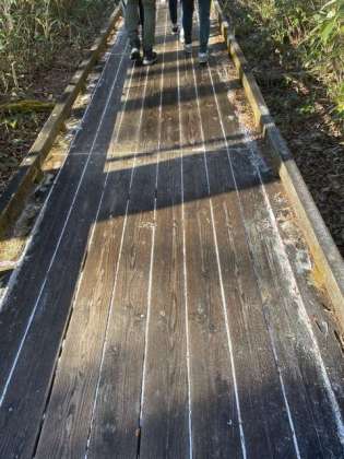 さて湯ノ湖畔からスタートです。 あれ、木道凍っています。