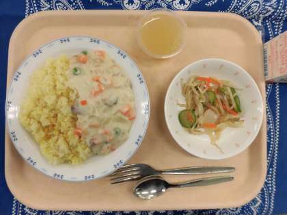 11/26 本日の給食 公開日 2021/11/26 更新日 2021/11/26 給食 〜今日の献立〜 えびクリームライス 牛乳 こんにゃくサラダ りんごゼリー 〜給食メモ〜 今日は、「牛乳」のクイズを出したいと思います。給食に、毎日牛乳が出るのは、なぜでしょうか? 1. のどがかわくから。 2. おいしいから。 3. 栄養がたくさん入っているから。 ※クイズのこたえは、「食材がとれたところ…」の最後にのせています。 食材がとれたところ・・・ 閉じる 食材がとれたところ… 米…埼玉県 鶏肉…青森県 たまねぎ…北海道 にんじん…千葉県 きゅうり…埼玉県 もやし…群馬県 クイズのこたえは、3の「栄養がたくさん入っているから。」です。その中でも、とくに注目したい栄養素は、「カルシウム」です。今日はえびクリームライスにも、牛乳がたくさん使われています。小学生の時期は骨が成長する時期なので、カルシウムをきちんととることが大切です。残さず飲んで、丈夫な骨や歯を作りましょう。