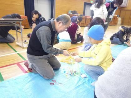 今日のふれあい広場は、恒例のたこ作りです。学校運営委員の金子さんと「たこおじさん」こと、根村さんのご指導で楽しい時間を過ごしました。