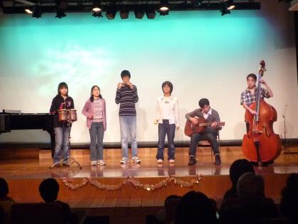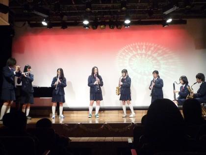 12/14 クリスマスコンサート その2 公開日 2008/12/14 更新日 2008/12/14 校長室より 用賀中学校の合唱部と吹奏楽部の出演です。 3年生が受験で引退した後を担う1・2年生ががんばって出演してくれました。 合唱部は少人数でしたが、部員のお父さんがギターを担当してくださったりして、とてもアットホームな演奏で心が温かくなりました。 吹奏楽部の、混合七重奏、木管八重奏さすがに中学生・・・上手です! 12月末のアンサンブルコンテストでの活躍を期待しています。