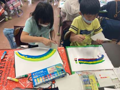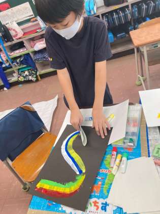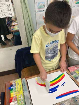 12/2__2年 図工 公開日 2021/12/03 更新日 2021/12/03 今日のできごと 『絵の具ひっぱレインボー』 画用紙の上に絵の具を直接出し、 型紙を使ってすーっと伸ばすと、 まぁ、すてき! きれいな模様ができました。 そこから、楽しいことを想像して クレパスで絵を描き足しました。 絵の具を伸ばすのが楽しくって、 夢中になっていた子どもたちでした。 iPhoneから送信