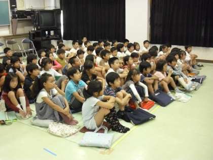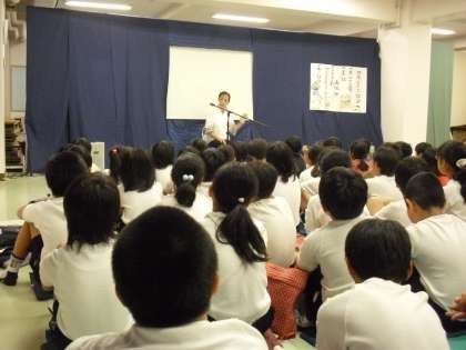 9/29 お話ランドのお話会〜4年生〜 公開日 2011/09/29 更新日 2011/09/29 校長室より 今日は4年生を対象に、「お話ランド」のお話会がありました。 今日は、 1、早口言葉 1、素話 寿限無(じゅげむ) 1、OHP劇 かた足ダチョウのエルフ 1、本の紹介 です。 素話もたくさんの笑いのツボがあり、ユーモアたっぷりです。 お話ランドの皆さんの巧みな話術に、子供たちは首をながーくして楽しんでいました。 お話ランドの皆さん、いつもありがとうございます。