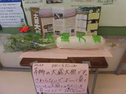 今日の「青菜とじゃこのごはん」と「おでん」に使われている大根は、世田谷区がJAや区内の農家の方々と協力し、8月に種まきから行って栽培した貴重な「大蔵大根」を使っています。そこでクイズです。「大蔵大根」の特長は、次のうちのどれでしょうか?