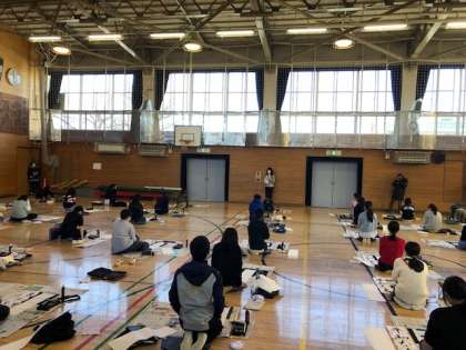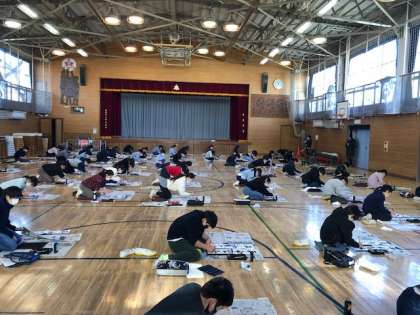 1/12 6年 席書会「平和な春」 公開日 2022/01/12 更新日 2022/01/12 学年 2学期〜冬休みの成果を出すべく、今日の席書会では集中して取り組みました。一画一画丁寧に書き、穂先を整えながら行いました。また、最後には四字熟語を長半紙に認めました。 しんとした中で、きれいに書くことができました☆