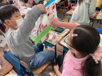 片面が出来上がった時に、お友達の作品と表と裏になるように穴を重ねて合体させて、一緒にお互いの世界を行き来して楽しみました。
