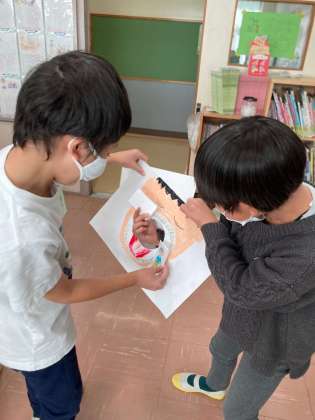 画用紙に穴を一つ開けて、その穴をいかした絵を描きました。別の画用紙で小さな自分を作り、穴を通し、向こう側の世界はどうなっているのかなと想像を膨らませました。