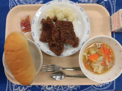 今日は、学校給食週間3日目です。今日の献立は、昭和30年代の給食を再現してみました。そこでクイズです。用賀小学校の今の給食では牛乳を飲んでいますが、昔の給食では何が飲まれていたでしょうか?