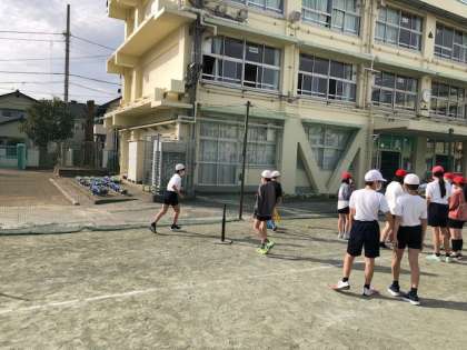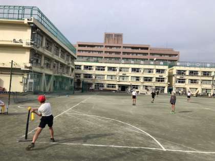 前回の1km走、よく頑張った6年生。校庭体育はティーボールを行っています。今回はゲームのルールを覚えて試合を行いました。昨年度も経験している競技、体が覚えているのか?よく動いていました。