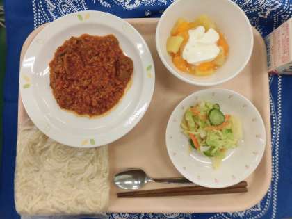 今日は、学校給食週間4日目です。今日の献立は、昭和40年代の給食を再現してみました。この頃、パンばかりだった給食に、ソフト麺が登場しました。そこで今日は、「ソフト麺」のクイズです。ソフト麺は、何のために作られたでしょうか?