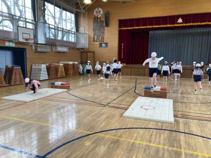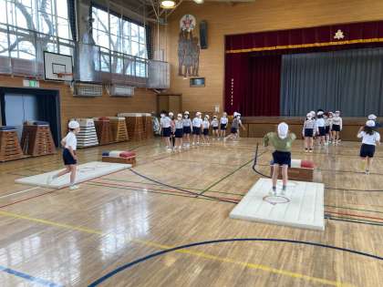 なるべく高く跳び、着地の時は、膝を柔らかく使って衝撃を吸収しようというめあてをたて、繰り返し練習しました。