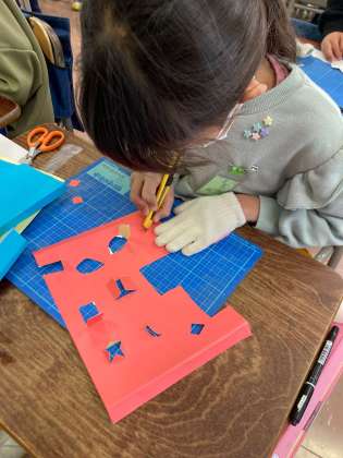 2/22 2年 図工 まどのあるたてもの 公開日 2022/02/24 更新日 2022/02/24 今日のできごと カッターナイフの練習を終えて、次は作品作りに進みました。 ハサミとカッターナイフを使い分けて、『まどのあるたてもの』を作っています。 カッターナイフだからこそできる切り抜きをふんだんに使って、窓やドアを作っています。 滑り台をつけようかな、お風呂やベランダも作ろう、学校を作りたいな。子どもたちの想像は膨らみます。 完成が楽しみです。
