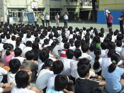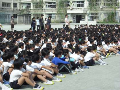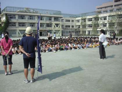 今日の避難訓練は、中休みに地震が発生し、その後、揺れがおさまったため校庭に避難するという設定で行いました。中休みですので、校庭で遊んでいる子どもが多くいました。サイレンの音とともに、子どもたちは瞬時に反応して、しゃがむ姿勢をとり、放送の指示をよく聞いていました。校舎の近くでしゃがんでいた子どもも、先生の指示で校庭の中央へと避難しました。