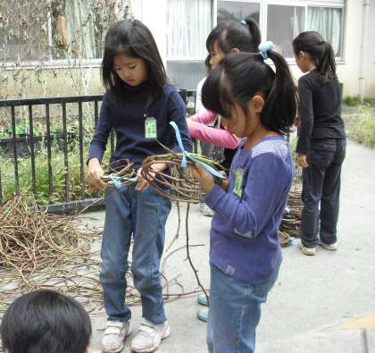 芋は絵に描き、そのあと給食でいただきます。茎は輪のようにして、クリスマスのリース作りをします。
