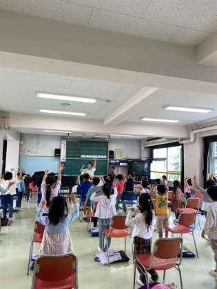 最初は「(白衣)どうやって着るの?」「どのぐらいお皿に入れるの?」等々、ドキドキの給食当番も、今ではかなりスムーズにできるようになりました。みんな「おいしい!」と、毎日たくさん食べています。音楽では、講師の先生の指導の下、「3秒のお約束」等を守りながら、体を動かして「セブン・ステップス」♪