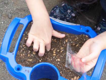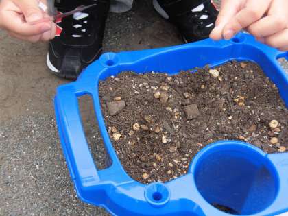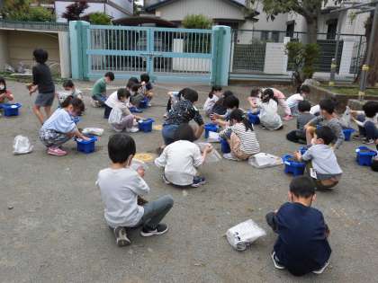 5/9 1年生 生活科 あさがおの種まき 公開日 2022/05/09 更新日 2022/05/09 学年 先週”種”の観察をした「あさがお」。今日の生活科の時間に、種をまきました。6粒の種を一つずつ大切にまいて、水をたっぷりあげていました。教室にもどった後、「○色のあさがおが咲くといいなあ!」「何色のあさがおになるのか、何個咲くのか、楽しみ!」と、その成長をとても楽しみにしている1年生です。