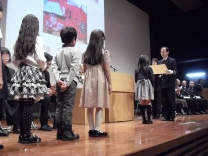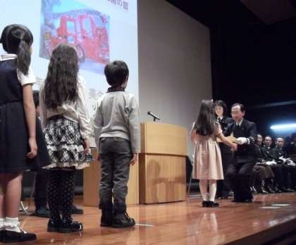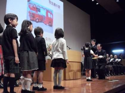 昨日「はたらく消防の写生会」の表彰式が駒澤大学深沢校舎でありました。本校からは、最優秀賞を含め、18名もの子どもたちが入選し表彰を受けました。玉川消防署長さんから賞状をいただくときに、「はい!」という、大きな返事が出ていたので嬉しくなりました。どの絵も消防車をしっかり見て、ていねいに描かれており力作ばかりです。7日の全校朝会で表彰します。表彰状を学校に持たせてください。本当におめでとうございました。