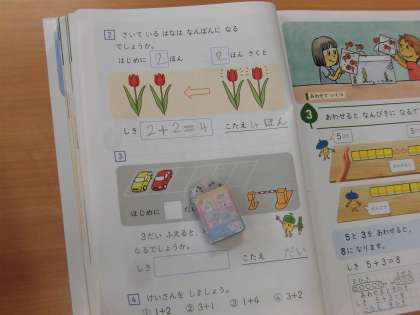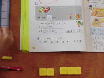 今日の算数は「ぜんぶで いくつ」。「お花が2本さいていて、もう2本さくと、何本になるかな?」「車が2台止まっていて、あとから3台増えると、何台になるかな?」という教科書のお話について、まずはみんなで「このお話を、絵やブロックなどを使って考えてみよう!(表してみよう)」。その後、「このお話を、たし算の式に表すには、どうすれば良いかな?」みんなで考えて問題を解きました。「増えると」という”たしざんの魔法”の言葉や、「+」や「=」の記号を使い始めて、たし算の学習を開始した1年生です。
