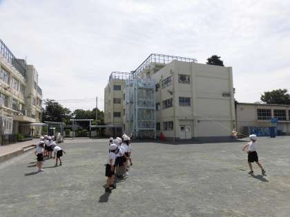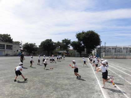 「ななめ上に向かって投げればいい!」「遠くの高いところをねらって投げれば?」等々、気づいたことを発表し合い、出た友達の考えも参考にしながら、体を大きく使って練習していた1年生です。