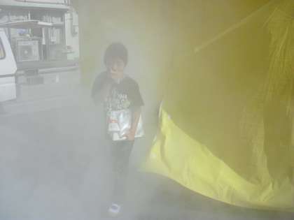5年生は、避難訓練のあとに煙中体験を行いました。煙の中はまわりが全く見えません。手探り状態で、姿勢を低くして歩きながら出口までたどり着いていました。