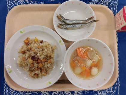 6/3 本日の給食 公開日 2022/06/03 更新日 2022/06/03 給食 〜今日の献立〜 山坂達者飯 牛乳 焼きししゃも 白玉団子汁 〜給食メモ〜 6月4日〜10日は、「歯と口の健康週間」です。健康な歯をつくるためには、よく噛んで食べることが大切です。そこでクイズです。一口、何回かむとよいと言われているでしょうか? 1. 5回 2. 10回 3. 30回 ※クイズのこたえは、「食材がとれたところ…」の最後にのせています。 食材がとれたところ・・・ 閉じる 食材がとれたところ… 米…埼玉県 豚肉…青森県 大豆…北海道 ちりめんじゃこ…広島県 ししゃも…アイスランド さつまいも…茨城県 ねぎ…茨城県 にんじん…徳島県 だいこん…青森県 クイズのこたえは、3の「30回」です。よくかむと、だ液がたくさん出るので、むし歯を予防してくれます。今日の給食では、かみごたえのある「山坂達者飯」、歯を丈夫にしてくれるカルシウムがたくさん入っている「焼きししゃも」を出しました。一口30回を目標に、しっかりかんで、残さず食べましょう。