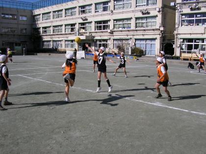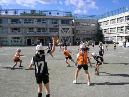 4年生の体育では、ポートボールを行っています。毎日寒い日が続いていますが、子どもたちは元気です。一つのボールを皆で追いかけて走りまわります。「寒さなんてなんのその」今も昔も「子どもは風の子」です。