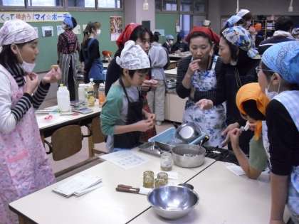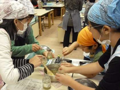今日は6年生の食育授業でジャムづくりをしました。セロリ、トマト、ゴーヤ、タマネギなどの野菜を使った健康的なジャムづくりです。まず、野菜を5ミリ角に切り、下ゆでした後、あくをとります。次に、砂糖にペクチンを混ぜて、水と野菜ジュースを入れて沸騰させます。さらに砂糖を加えながら、最後はクエン酸を溶かしたレモンジュースを加え出来上がりです。子どもたちは味見をしたあと、小瓶にジャムを入れて持ち帰りました。私も初めて食べてみましたが、野菜の歯ごたえや苦みがよく効いていておいしかったです。お料理に使ってもおいしいなと思いました。