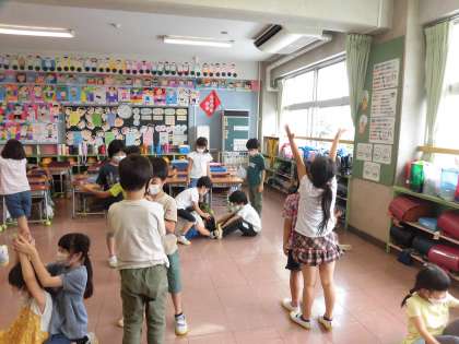 今日の日本語は「いろいろなものに なりきってみよう<1>」です。「もの」のかたちを、身体を使って表現します。前回のお題「木になりきってみよう」に続き、今回は2回目・「花になりきってみよう」。二人組で相談して考えた”花”の形や動き等を楽しく表現しました。