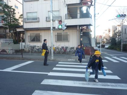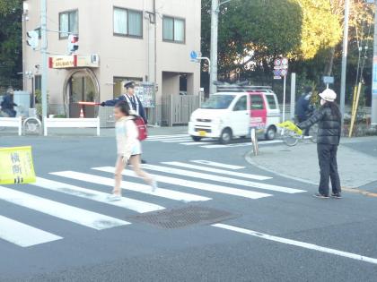 馬事公苑の駐在所前の交差点には、いつも見守ってくださる西條さんと駐在さん、そして旗を持ったお母さんがいます。