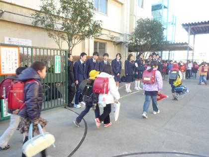 近隣の運送会社の社員の方も安全ボランティアとしてあいさつと旗振りをしてくださいました。もちろん、今年も用賀中学校の先生と生徒が正門前で礼儀正しいあいさつをしてくれました。本当にありがとうございました。
